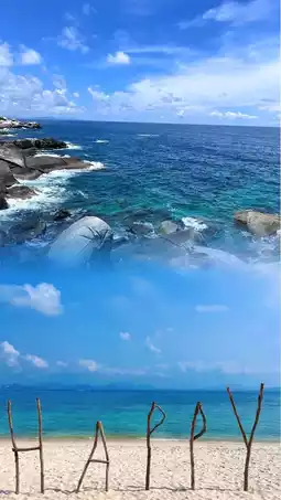 ✅Seaside Bathing Beach: Has a few coconut trees, the sea is bright blue and photogenic; sitting and resting is comfortable, but beach chairs reportedly charge a fee, so ask first