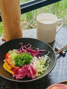 Sunlight fills the room through the oversized 🪟 floor-to-ceiling windows. Have a cup of ☕️ coffee by the window and enjoy the eight-plate breakfast of selected Hainanese flavors 🥣. After the meal, eat some fruit 📕 and look at the scenery