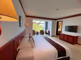 The "Scenic Eco Room" is amazing 🌿, featuring floor-to-ceiling windows with stunning views. Open the curtains to lush greenery, wake up to sunlight streaming in, and enjoy a hearty breakfast at the restaurant, accessible via room service. The breakfast spread includes porridge, dim sum, fruits, and more. After fueling up, take a leisurely stroll to the Nanshan Scenic Area to visit iconic spots like the majestic Sea Goddess of Mercy statue and the ancient Nanshan Temple. No rush, no crowded transportation—just pure relaxation and a perfect vacation experience!