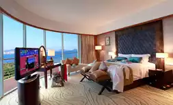 Step into the suite, where panoramic floor-to-ceiling windows offer an unobstructed view of the majestic seascape of Sanya Bay. Whether it's the sunrise painting the sea in hues of red or the starlit sky at night, every scene is your private spectacle. The suite features a modern, understated luxury design, blending warm wooden elements with oceanic blue accents, exuding both elegance and the relaxed charm of a seaside getaway. The bedroom boasts a 2.2-meter oversized scenic bed, allowing you to take in the entire bay view from the comfort of your bed. The spacious and bright living room is perfect for business gatherings or family reunions, showcasing impeccable style. The exclusive bathroom, equipped with branded toiletries, lets you enjoy the company of sea breezes and sunlight even during your bath.