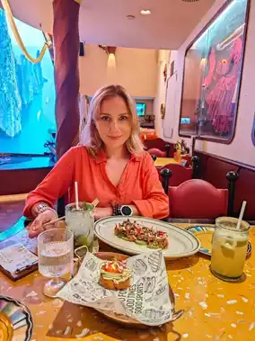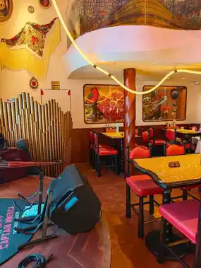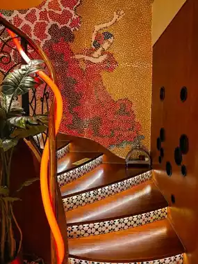 ✨ The bar itself is small but very atmospheric. The interior transports you straight to Spain: waitresses in flamenco-style dresses, fans, castanets, guitars, tambourines decorating the space. In the evenings, there are live performances, and at the center — the Sambomba, Spanish drums. The flamenco rhythms are infectious, and you’ll find your feet tapping along.