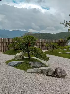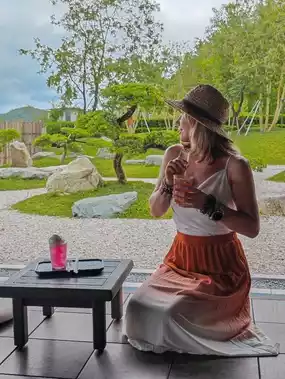 🌼 We arrived in the morning, when there were hardly any people around. We grabbed tea and an ice cream shake, settled in on the terrace in front of the Japanese garden, and simply lost ourselves in the moment. Before our eyes were manicured bushes, smooth stones, dwarf pines, and distant hills shrouded in mist. We sat there, absorbed in this tranquility, and it felt like Hainan was disappearing—as if we'd been transported to a Japanese island.