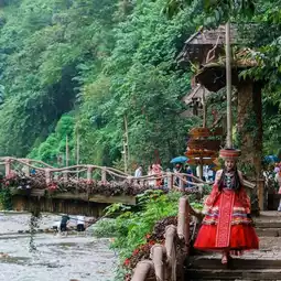 📝 The waterwheel in Cat Cat Village offers visitors a chance to experience traditional agricultural methods. This large waterwheel, made of bamboo, demonstrates how rice is pounded using the flow of water. The surrounding area is adorned with various blooming flowers, creating a picturesque landscape. Visitors can cross a small bridge next to the waterwheel and enjoy the refreshing sound of the stream. Additionally, there are shops around the waterwheel that sell simple traditional foods, allowing visitors to taste local cuisine and spend a leisurely time.