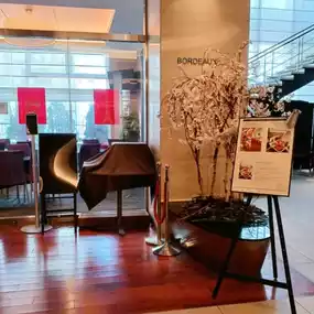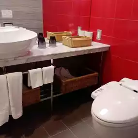 The entrance, restaurant, and bathroom in the room are all very impressive with their vivid red color.