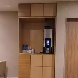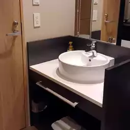 The guest room has a sink just inside the entrance, arranged like a counter kitchen.