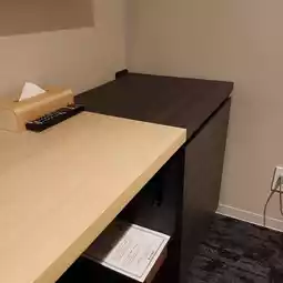 There is a drawer on the left under the desk, and a refrigerator on the right.
