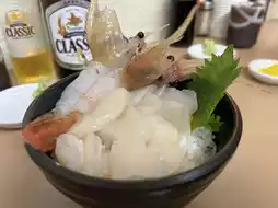 Breakfast at a store that serves seafood bowls and grilled fish.