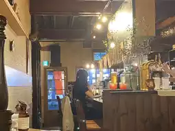 The restaurant has a cute sign and both a counter and private rooms.