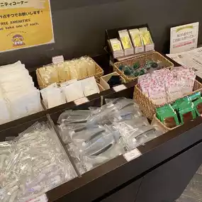 Amenities in the 1st floor lobby: Disposable toothbrushes, hair ties, razors, bath salts, etc. are provided, so you can take them freely. Towels, slippers, and pajamas were brought to the hotel room door every day during my stay.