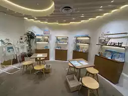 There are tables and seats in the eat-in space, and the store's goods are on display around the seats!