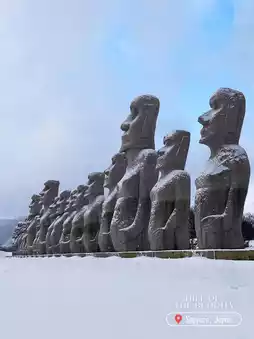 ทันทีที่ผ่านประตูเข้ามา จะพบกับรูปปั้นหินโมอายจำลองขนาดใหญ่ทั้ง 33 ตัว ซึ่งตั้งอยู่บนเนินทางเข้า ตรงข้ามกับรูปปันจะเห็นเศียรพระที่โผล่พ้นเนินสีขาวที่ปกคลุมไปด้วยหิมะมาแต่ไกล โดยช่วงฤดูใบไม้ผลิ,ฤดูร้อนเนินตรงนี้จะปกคลุมไปด้วยดอกไม้