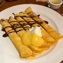 Hokkaido custard pudding🍮 A firm square pudding topped with rum raisins and cream! This plump custard pudding is soaked in rich caramel and is so delicious! Buttermilk Crepes Thinly rolled crepes made with plenty of buttermilk, crispy on the outside and soft and chewy on the inside♡