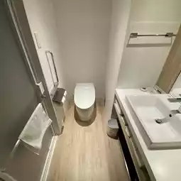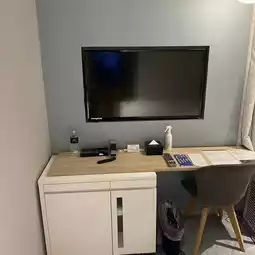This is the room I stayed in. I stayed in a superior single room this time. The room had a very calm design, but it had quite a few features. The outlet was equipped with a USB port, which was nice. You could check the availability of the laundry and restaurant on the TV. The sink, toilet, and bathroom area had a simple design that reminded me of an apartment building.