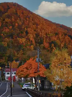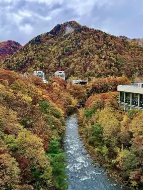 Every autumn, Jozankei Onsen in Hokkaido becomes an ideal destination for viewing red leaves. It is surrounded by mountains, and the hot spring steam and red leaves are intertwined to form a picturesque autumn scenery. Visitors stroll along the river trail, where the maple leaves on both sides are as bright red as flames, contrasting beautifully with the blue sky and clear stream water.