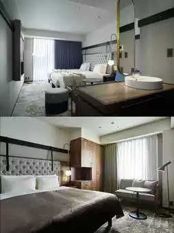 You'll be drawn in by the unique brick entrance and restaurant exterior, inspired by the nature and culture of Hokkaido. The modern, calm tones make you feel both comfortable and stylish. 🎨 The rooms also reflect the essence of Hokkaido, making you feel like you're in nature.