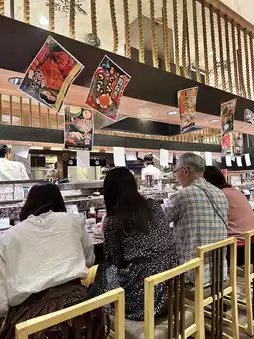 The seats are arranged around the kitchen, so you can see the chefs making sushi up close from both the counter seats and the box seats.
