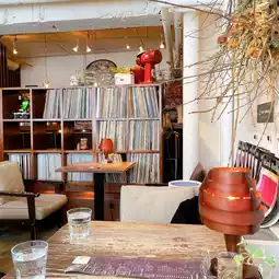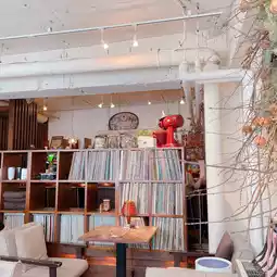 Jazz music is playing inside the shop, and the shelves are full of records.