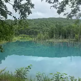 Unrealistically blue pond and majestic waterfall—truly a healing experience.