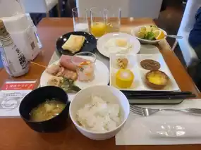 The hotel is located in the heart of Susukino, but I opt to rest instead of going out. I go to bed around 1 AM, wake up at 6 AM, get ready, and head to breakfast. After checking out, I wait for a table as the restaurant is fully booked.