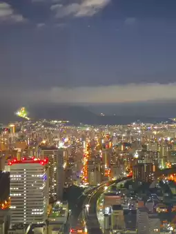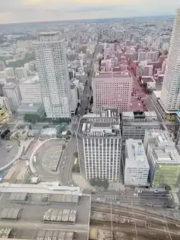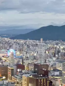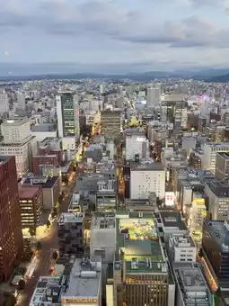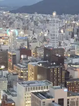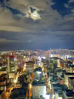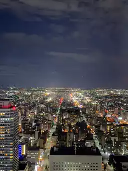 At night, the JR Tower Observation Deck T38 feels like a galaxy reserved just for the two of us. The lights of Sapporo twinkle beneath our feet, with the distant mountains and antennas forming a silhouette. The entire city glows gently before us.