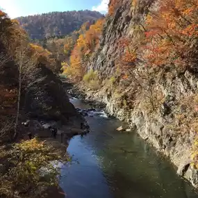 Jozankei Onsen is located in Hokkaido, Japan. There are many onsen hotels here, and many tourists come here to enjoy the autumn leaves, especially around the red Futamitsuri Bridge, considered the most beautiful spot in Hokkaido.