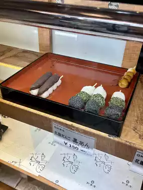 We tried three varieties: sesame, soy sauce, and matcha bean paste. The dango was surprisingly soft and had a delightfully chewy texture. The sesame was fragrant, the soy sauce was sweet and salty, and the matcha bean paste had a subtle bitter-sweet flavor. Beautiful in appearance, this is a Japanese dessert that's highly satisfying, even with just one stick.