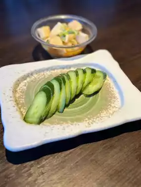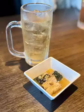The Aonori (Long-fried Green Laver) Fried Dashi Tofu has a rich aroma and a gentle flavor. The grilled Komai is fragrant, and the kushikatsu is light and crispy. The pickled cucumber and nagaimo kimchi are perfect palate cleansers.