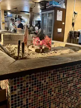 A famous bar offering the perfect trifecta of primitive grilled food, fresh fish, and a night view.