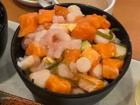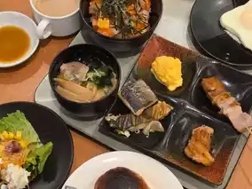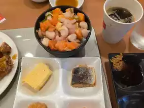 🍱 Breakfast has a good selection, including rice bowls with salmon, shrimp, salmon roe, and egawa.