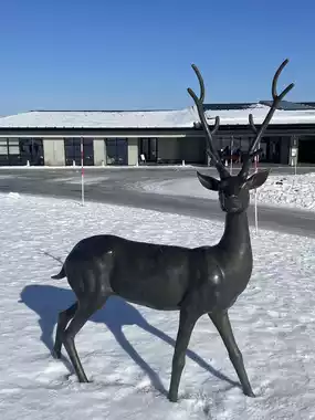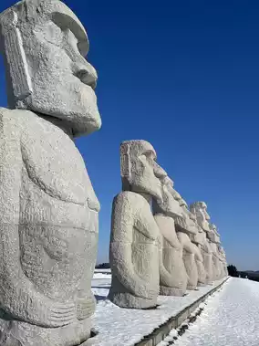 Within the cemetery, you'll find beautiful cherry blossoms, autumn foliage, and a grassy plaza. When I visited during winter, the snow-covered scenery was breathtakingly beautiful. The site features replicas of famous landmarks such as Stonehenge, Moai statues, and a massive Buddha monument, making it a great spot for taking photos.