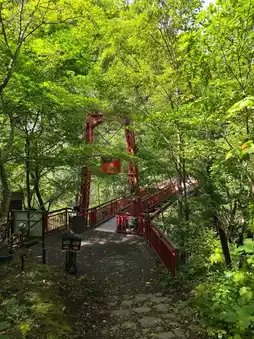 Futami Suspension Bridge is a representative landmark of Jozankei Onsen Village in Hokkaido. This beautiful red bridge is installed over the deep valley of the Toyohira River that flows through the Jozankei area. From the bridge, you can enjoy iconic views of Jozankei, including the Futami Rock rising in the middle of the river and the Kappa-buchi, which is said to be home to the legendary Kappa spirit.