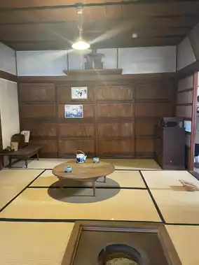 In another traditional Japanese house, tatami mats covered the entire room, with a low table and tea set in the center. Old posters and a household shrine adorned the walls, creating an uncanny sense that someone had just stepped out moments ago.