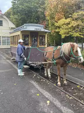 One of the most unique experiences in the village is the horse-drawn tram. This mode of transportation actually existed in Sapporo during the Meiji era and has been recreated here. The horse leisurely pulls the tram along the tracks, flanked by golden autumn leaves and vintage Western-style buildings, creating a dreamy scene.
