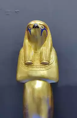 The "Underworld King" Osiris had a green face and hands; after resurrection, he fathered Horus, the "protector god of the pharaoh." Horus symbolized royal power and was a falcon-headed warrior god, wearing a linen kilt and holding the Was (power) scepter and Ankh (life) symbol.