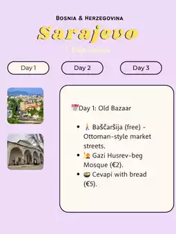 #holidayitinerary Sarajevo in Sarajevo Canton, Bosnia and Herzegovina, is one of those cities that instantly captures your attention with its mix of cultures and history. Walking around the old town, Baščaršija, feels like stepping back in time, with cobblestone streets, traditional shops, and the smell of fresh coffee and ćevapi filling the air.