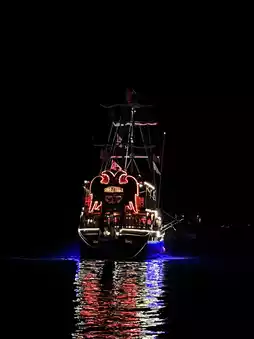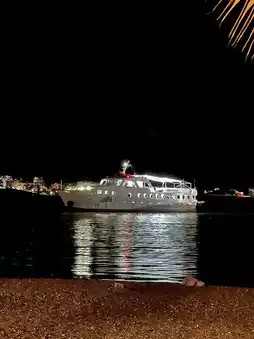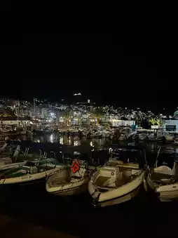 The city lights reflect on the Ionian Sea, creating a sparkling atmosphere along the coastline.