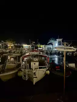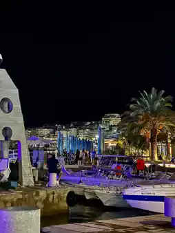 The lively promenade is filled with people enjoying evening walks, music, and the vibrant energy of seaside cafés and restaurants.