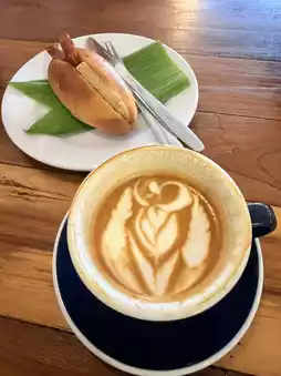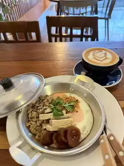 Driving along for fun, let's stop by this breakfast restaurant that I really like. It's decorated well and has a great feel. The shop is an old house on the side of the Chiang Mai-Lamphun road, between Ton Yang road. The shop has a lot of menus to choose from. The coffee is also very good quality. Every corner of the shop is photogenic. The light is beautiful. Today we ordered a hot latte + a pan-fried egg set, Vietnamese bread. It was so filling and delicious that we wanted to tell others. Anyone who comes to this road must not miss it.