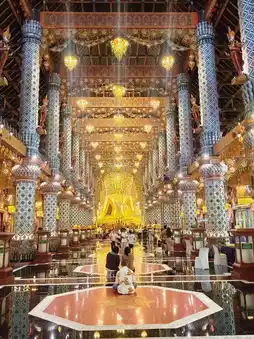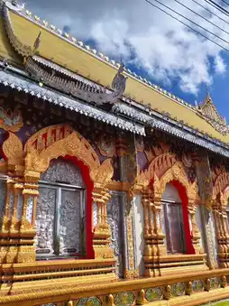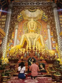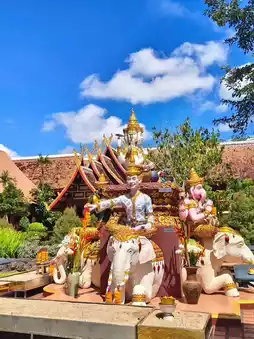 ✨Many people may know Wat Sri Don Moon in Chiang Mai for its magnificent Luang Por Phet Buddha statue, a large Buddha image in the viharn. But there's more to this temple than just that. The exterior of the viharn features a reenactment of the important event when the Lord Buddha descended from the heavenly realm of Sangkassa, where he spent the Rains Retreat in the Davadungsa Heaven to preach to his mother. After the end of the Rains Retreat, he returned to the human world. Upon seeing the offerings made by the gods and humans, he opened the world, allowing all gods and humans to see heaven, the human world, and hell. The gods saw humans, humans saw gods, and hell beings saw humans and gods. They all saw each other in all three realms, hence the name "The Day the Lord Opens the World." The Lord Buddha emitted six-colored rays as he descended from Davadungsa Heaven. Indra created three staircases: a golden staircase, a glass staircase, and a silver staircase, with the top of the stairs resting on the summit of Mount Sumeru. The staircase is located at the gate of Sangkassanakorn. When the Lord Buddha descended, he used the crystal staircase, which is located between the silver and silver staircases. The deities descended on the golden staircase, while the great Brahmas descended on the silver staircase. This procession is called the Thevo Rohana, which is the origin of the Thevo Rohana alms-giving ceremony, which continues to this day. This event is beautifully and atmospherically recreated here.