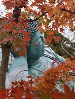 The grounds are larger than you'd expect, and in addition to the Nirvana Buddha statue, there are many other attractions, including Daisho Acala, the cedar tree struck by lightning, and the Seven Lucky Gods Tunnel. We were able to see the autumn leaves in early December.