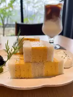 The sandwich features a thick Japanese-style rolled omelet, accompanied by whipped cream topped with yuzu pepper, nori tsukudani (seaweed simmered in soy sauce), and black pepper. This unique combination is truly surprising! Pairing the flavorful rolled omelet with nori tsukudani or whipped cream creates an unexpectedly delightful taste.