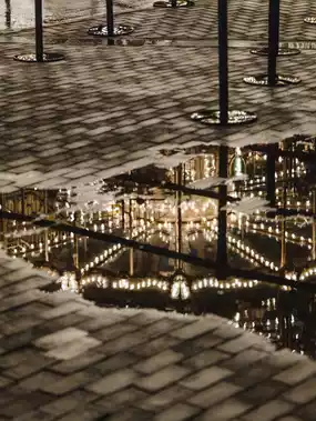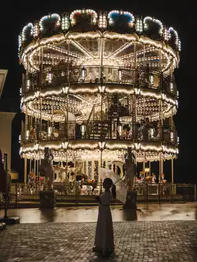 It was raining that day, so the merry-go-round's reflection in the puddles was beautiful!