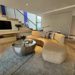 Ground floor: It is a very large living room with a sofa, work desk, dining table for 4 people, overlooking the private pool on the Terrace and there is also a convenient toilet downstairs.