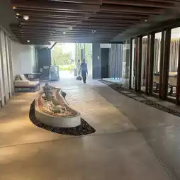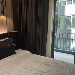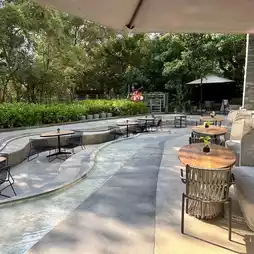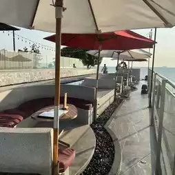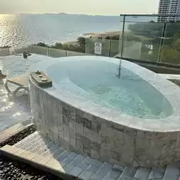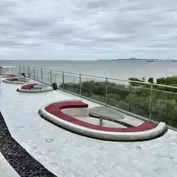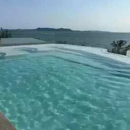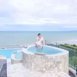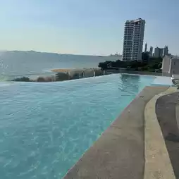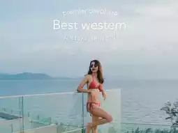 Come to visit a hotel in Pattaya, Na Jomtien, by the sea, Bayfia Pattaya, a hotel with a unique beautiful swimming pool, a jacuzzi, a good view, and a reasonable price. We booked during the school break, with a promotional price of 3,090.-, including pizza, Korean chicken sauce, and 2 cans of drinks. Our room did not face the sea view, but there was a room with a bathtub and a sea view at another price. It was an Executive room. There were 2 breakfasts: upstairs and downstairs. The breakfast here was acceptable, nothing special. There was both an air-conditioned area and an outdoor area. The hotel was not very big. The staff were polite and provided fast service.