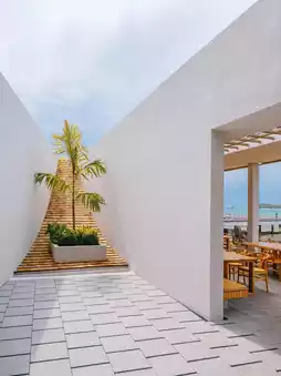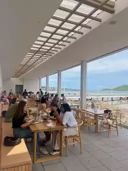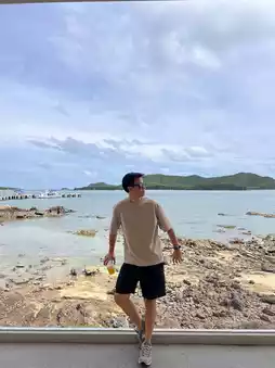 The interior of the cafe is decorated with wooden furniture, helping the mood in the shop to look warm. It has a minimalist, Korean, and Korean feel. For the menu in the shop, there are many menus to choose from, from savory dishes, drinks and desserts. We tried the Non Coffee menu. It smells good. The taste is not too sweet. It goes well with the dessert menu. It is a cafe where we can enjoy the view of the beach and listen to the sound of the waves. Anyone who has a plan to relax in Chonburi can stop by and try it. The shop is beautiful. The price is cute. Every corner is beautiful and great for taking pictures. It's real. I'm not kidding. This place is also pet friendly.