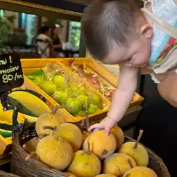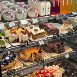 The cafe area is spacious, has lots of seats, and a warm atmosphere. There are many bakery and dessert shops, as well as fresh vegetables and fruits for you to choose from.