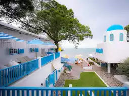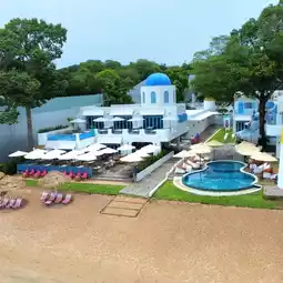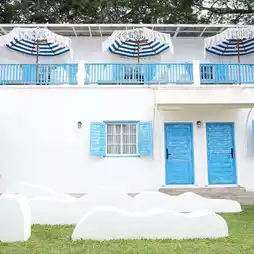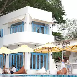 Newly opened beach cafe in Pattaya that you shouldn't miss. It comes in a Santorini style, bright colors, and is right on the sea. This place also offers accommodation. The atmosphere is great and there are many great photo spots. 🏖️✨