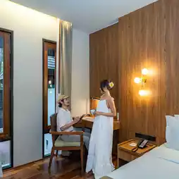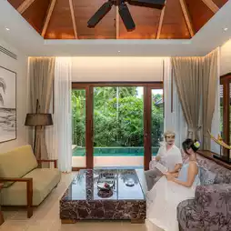 Wan and Fook came to relax for 2 nights, so we chose to stay in 2 types. The first night, we stayed in the Pool Villa Suite, a villa with a private pool, surrounded by shady trees. The second night, we stayed in the Ocean Front Pool Villa Suite, a private pool villa by the beach. Decorated in a beautiful and chic style of