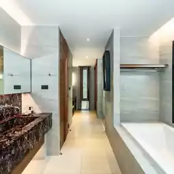comfortable, the bedroom and bathroom are separated very well. In the bathroom by the mirror, there is a bathtub to soak in and chill.