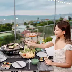 serving A-list food. For dinner, we recommend going up to eat delicious shabu while enjoying the beautiful sea view. It's really good for the heart. Or if you're a chill person, order a cold drink to sip and enjoy the view.
